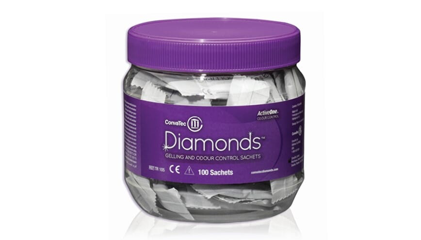 Diamonds™ geleringsposer med ActiveOne™ luktkontroll omdanner flytende innhold til mer fast og reduserer eller eliminerer overflødig gass, noe som gjør det mulig for brukeren å oppnå en flatere, mer diskret pose.