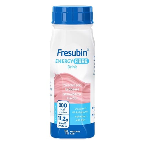 Fresubin Energy Fiber DRINK er en fullverdig og energirik næringsdrikk med fiber og jordbærsmak, 4 x 200 ml.