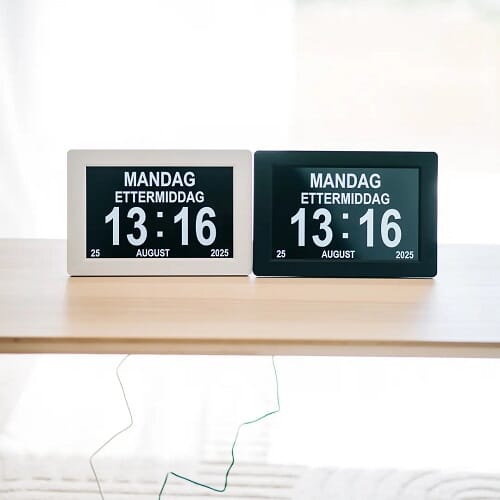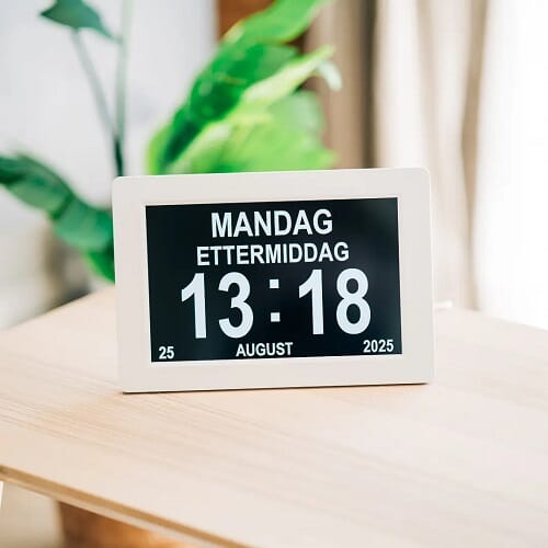 Den store skjermen viser dag, dato og klokkeslett med klare bokstaver i 24-timersformat. Alt vises med fullstendig navn, som «Mandag 18. november 2025», noe som reduserer forvirring og gir trygghet i hverdagen – spesielt for personer med mennesker eller hukommelsessvikt.