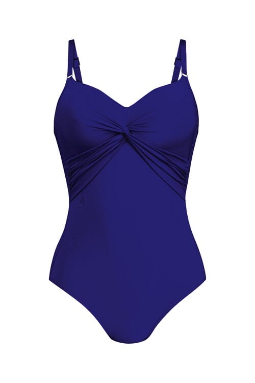 Badedrakten har en sammenflettet wrap-drapering og stoffstropper som gir et spesielt feminint utseende.