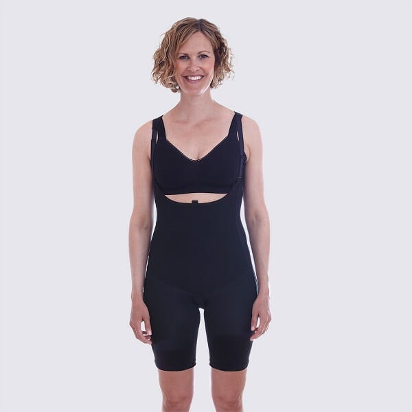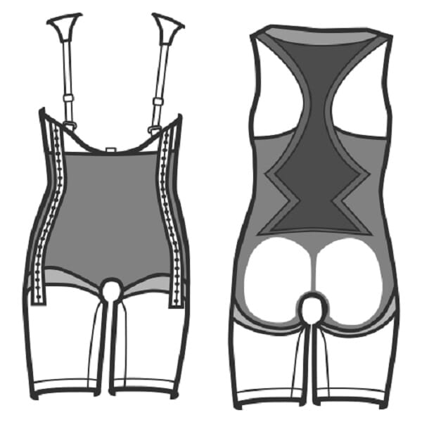 Kompresjons-body med høy rygg i strikket sømløst materiale. Anbefales etter inngrep i mage, sider og rygg, f.eks. fettsugning og/eller kirurgi. Bodyen har hekte- og krok-knepping på begge sider for enkel av- og påtaking/justering av passform.