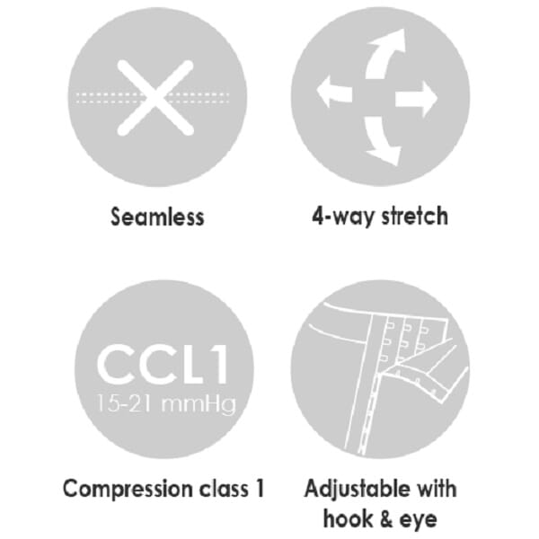 Indikasjoner: Anbefales etter plastiskkirurgi. Kompresjon forbedrer sirkulasjonen og minsker risikoen for hevelse etter operasjon, gir bedre heling og i tillegg smertelindring. Tilsvarende kompresjonsklasse 1.