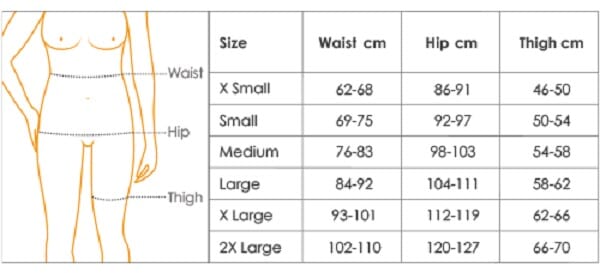 Måltaking: For å oppnå optimal passform og korrekt kompresjonsgrad er det viktig å prøve plagget i henhold til måltabell. Plagget skal sitte fast, men må ikke kjennes ubehagelig eller stramme.