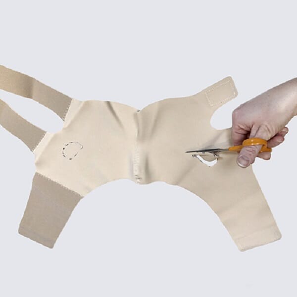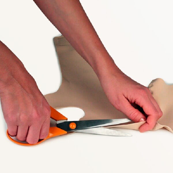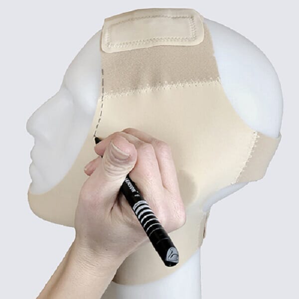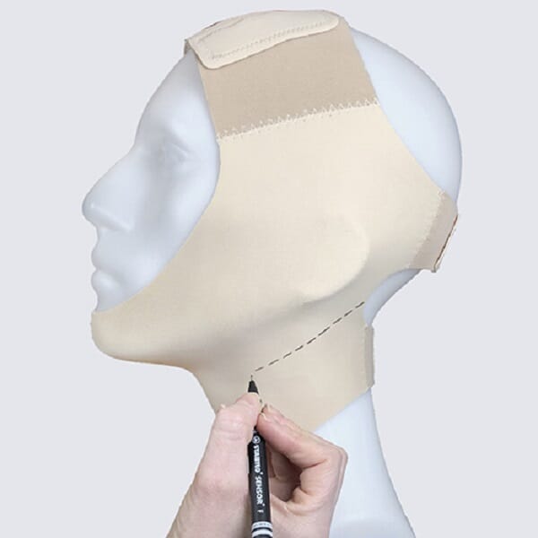 Kantene på bandasjen er klippbare, noe som gjør at bandasjen kan trimmes rundt kinn, hake og hals for å gi optimal passform.