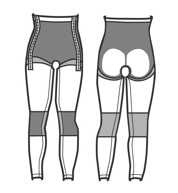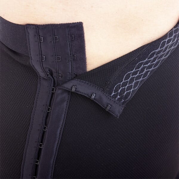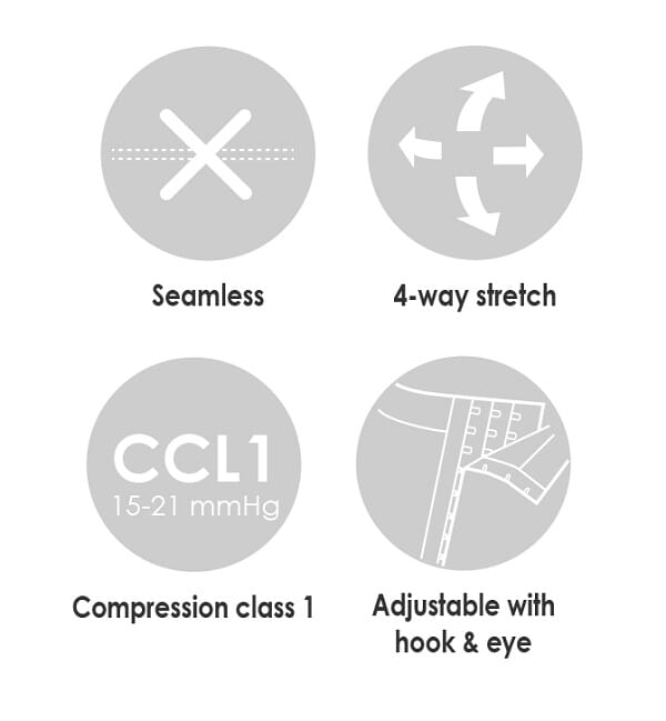 Anbefales etter inngrep på ben, og buk ved fettsuging og/eller kirurgi. Hekte- og krok-knepping på begge sider for enkel av- og påtaking/justering av passform.