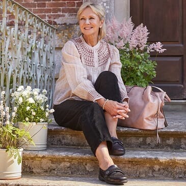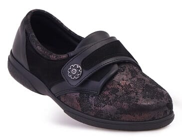Den åpner seg også slik at det er lett å få på en hoven fot. Med en polstret innersåle og mykt polstret pløs øker komforten. Fronten av skoen er laget av myk, elastisk elastan som ikke legger press på hevelser eller smertefulle tær. Borrelåsfestet er skjult med en pen pynteknapp.